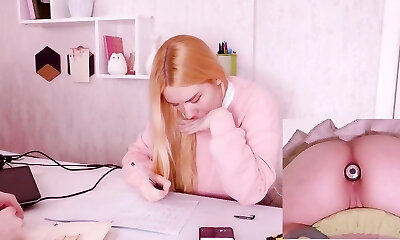Helping my sister in law with homework but she's too distracted with vibro plug in her ass!