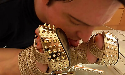 slave getting high heel sounding from mistress