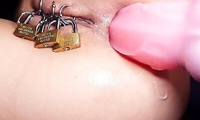 Fisting of Rectal when Caged Pierced Pussy Closed by Padlock