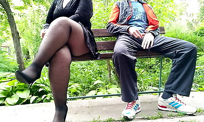 Unacquainted MILF in pantyhose stroked off my cock in the park on a bench